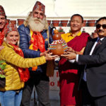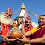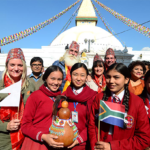 146 days after leaving from Cape Town, what an incredible welcome we received in mystical Kathmandu – hundreds of Nepalese children lined the streets waving South African and Nepali flags.  At the 600-year-old World Heritage Site of the Boudhanath Stupa, the holiest Buddhist temple in Kathmandu, senior Buddhist monks, TV crews, VIPs from Nepal Tourism, the City of Kathmandu and the South African Honorary Consulate joined our weary expedition team in a vibrant end-of-expedition ceremony.  Slowly, we emptied the expedition’s Zulu calabash of well-travelled Cape Atlantic seawater over a sacred, golden Buddhist shrine, as Nepalese well-wishers endorsed the Madiba100 Scroll of Peace and Goodwill, already chock-full of messages from wonderful people we met along the route.  The three expedition Land Rovers also received special permission to do a lap of honour around the Boudhanath Stupa – what an honour!